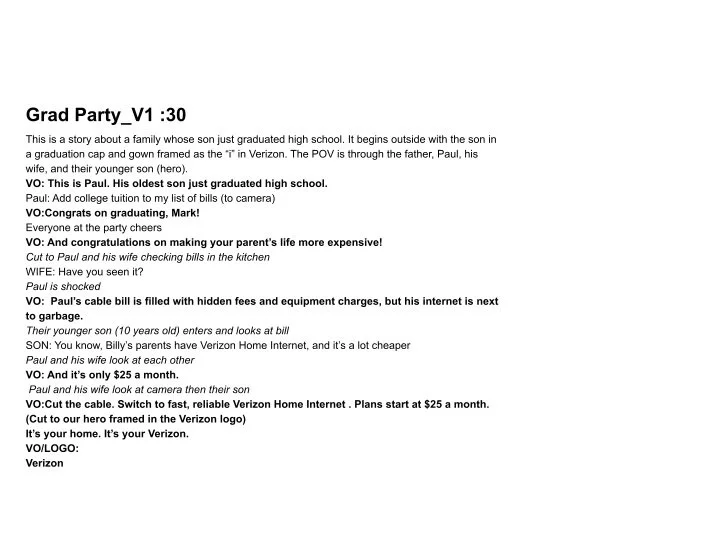 Wrote brand voice scripts and campaign copy reintroducing Verizon Home Internet as personal, simple, and on your terms. Framed value props through character-driven storytelling and VO lines. Anchored the message with: It’s your home. It’s your Verizon.